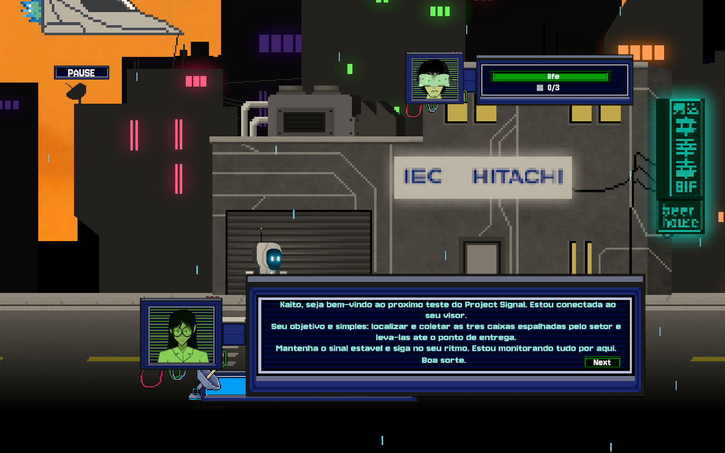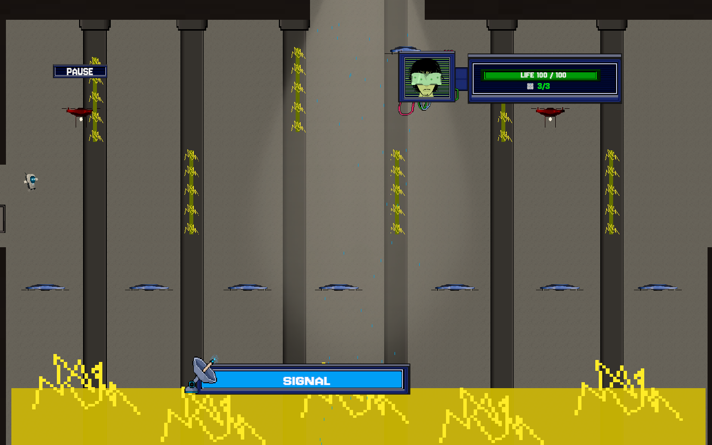 Neste mundo chuvoso e futurista, você carrega um recurso vital: o Sinal. A chuva destrói seu sistema, então, sempre que estiver ao ar livre, seu sinal cai rapidamente. Mantenha-se debaixo dos prédios ou estruturas para sobreviver durante a missão!